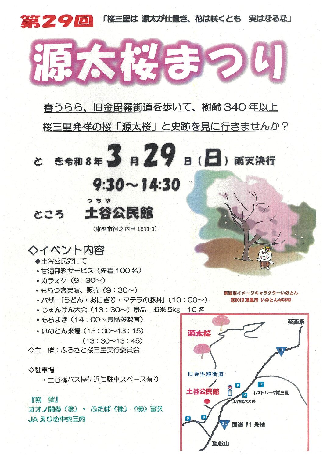 樹齢約340年、東温市の天然記念物に指定されている2本の「源太桜」。源太桜を見守っている「ふるさと桜三里会実行委員会」は、平成7年に結成され「源太桜まつり」を開催しています。