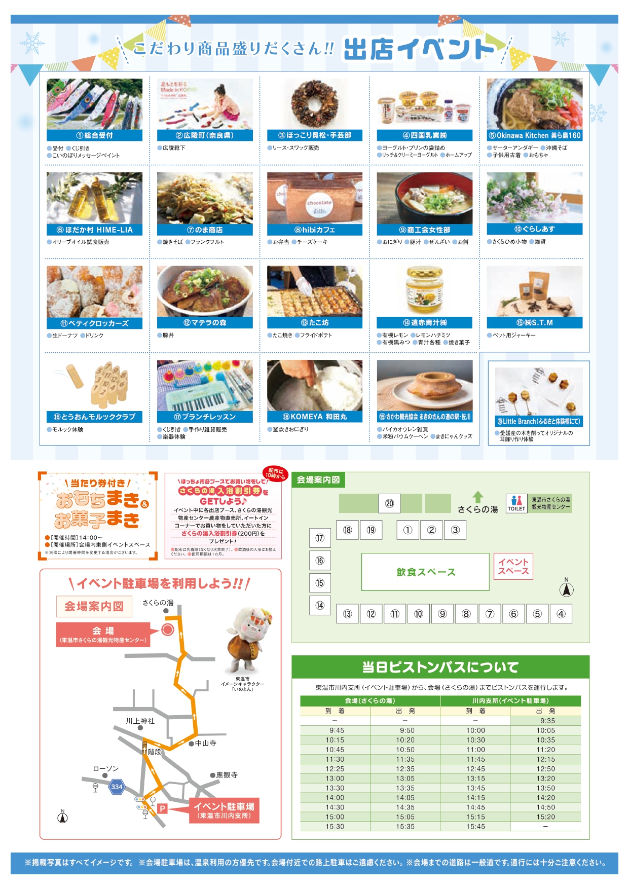 美味しいものやこだわり商品の販売、当たり券付おもちまき&お菓子まきなど家族で楽しめるイベントとなっております。