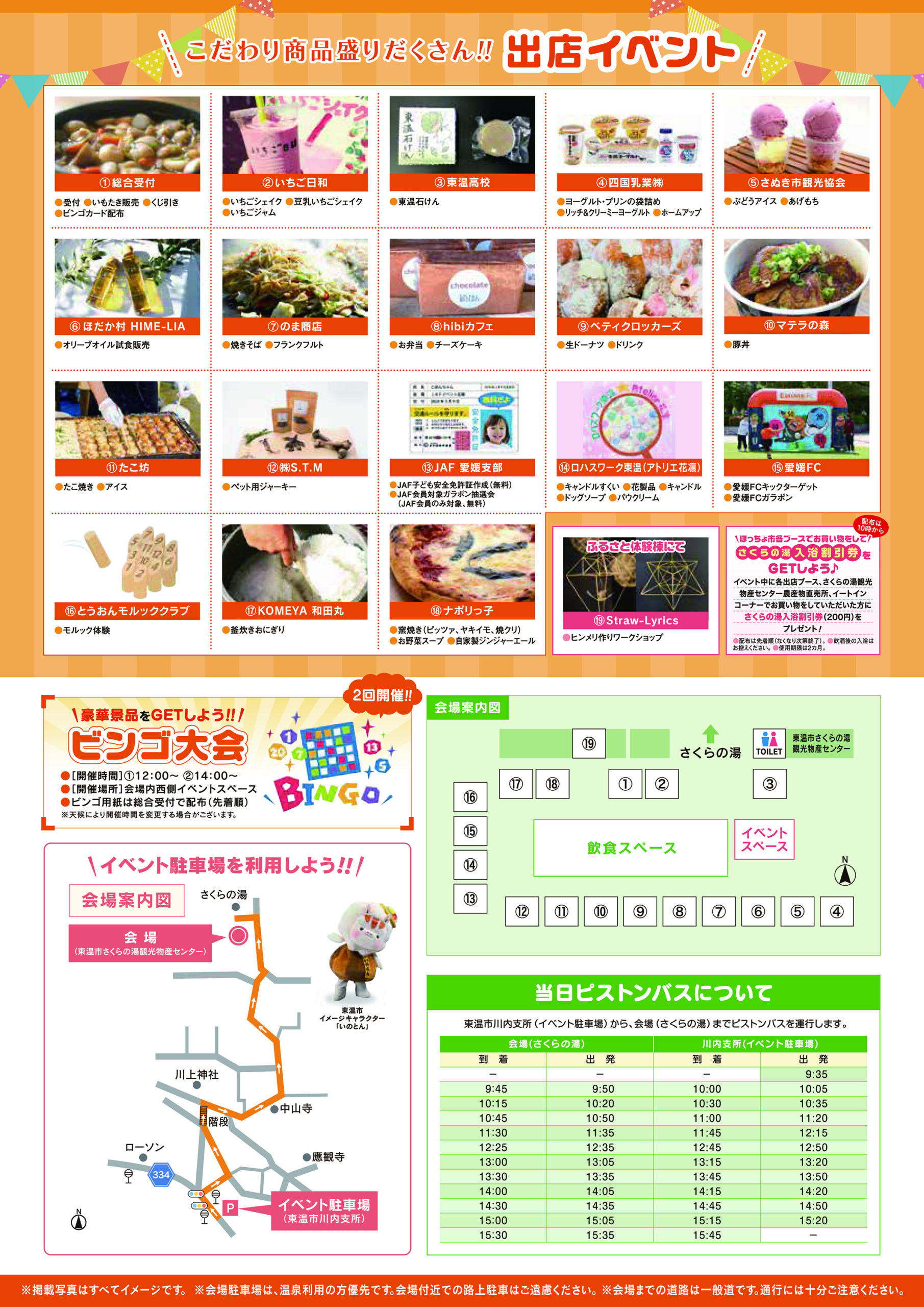 本市観光拠点である東温市さくらの湯観光物産センター、東温市ふるさと交流館さくらの湯を会場として市内業者や県内外の交流市町の連携・協力した特色ある観光・物産展を四半期に1回開催し、年間をとおして賑わいを創出し、交流人口の回復・拡大や地域の活性化を目指します。